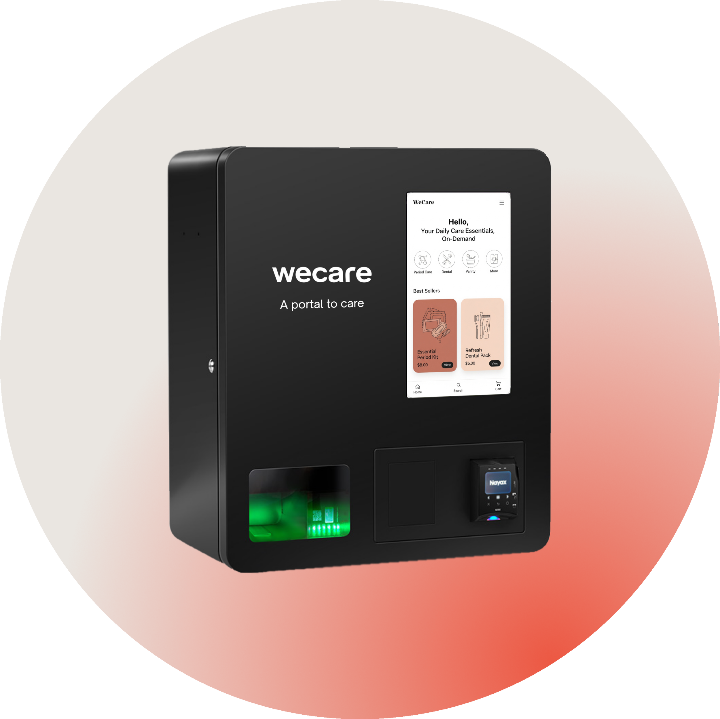 The machine monitors its own stock. When a kit is sold, our dashboard alerts the WeCare team. We restock it before the next guest even knows it was low.