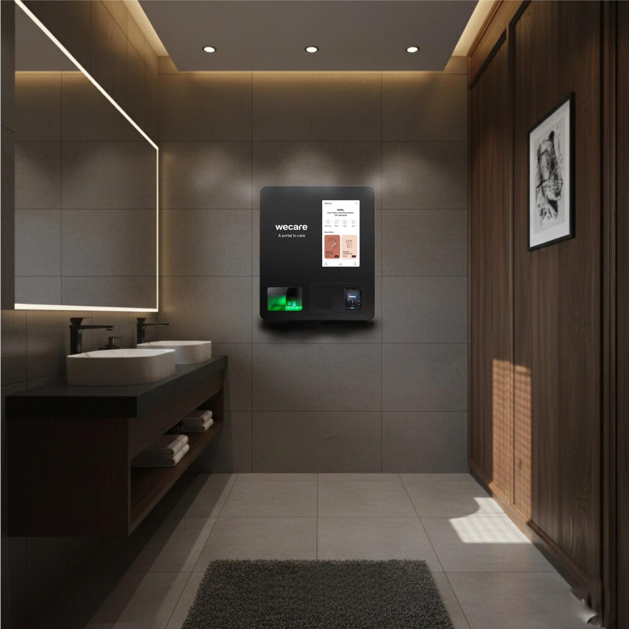 WeCare portals care for your guest satisfaction. Wall-mounted dispensers filled with hygiene essentials.